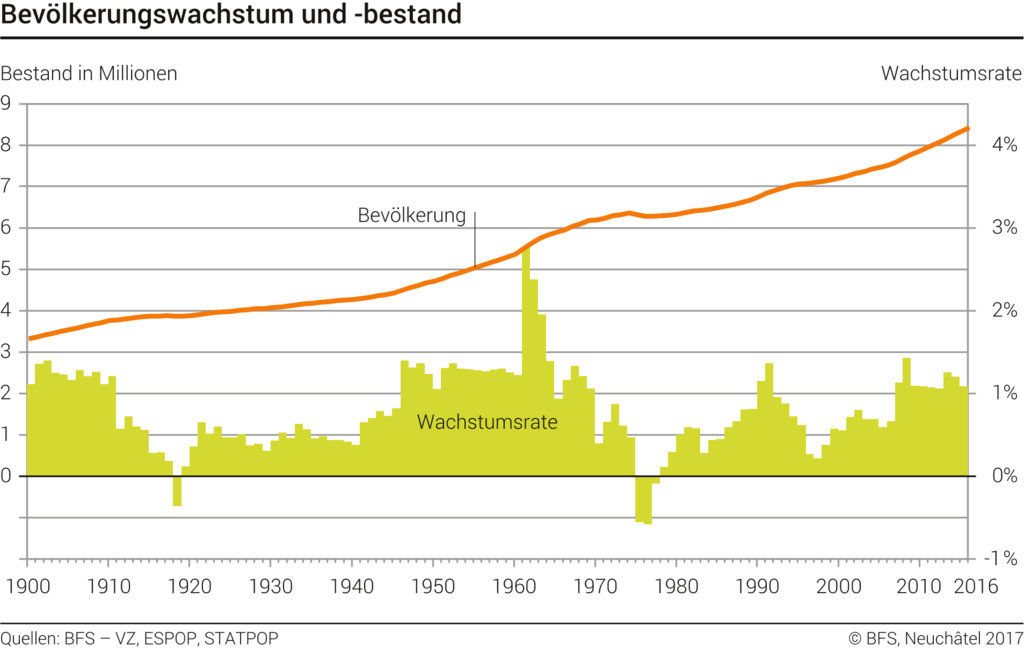Das Bundesamt für Statistik erstellt alle fünf Jahre Modellrechnungen zu Bevölkerungsszenarien – und musste jeweils schon fast traditionell drastisch nach oben korrigieren. Jüngstes Beispiel: Vor der letzten Prognose im Jahr 2015 ging das BFS davon aus, dass die Grenze von 9 Millionen Menschen erst nach dem Jahr 2060 erreicht wird. Laut der jüngsten Prognose wird diese Zahl bereits im Jahr 2023 erreicht sein. Die letzte Aktualisierung geht von einem Bevölkerungswachstum von 9 Prozent zwischen 2015 und 2024 aus. Die aktuelle Bevölkerung beträgt bereits heute knapp 8.5 Millionen.
