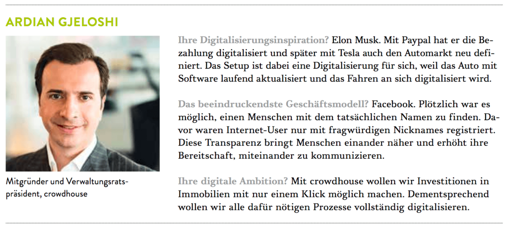 Das C-LEVEL-Magazin hat in seiner aktuellen Ausgabe die 100 Top Digital Shapers der Schweiz gekürt. Die Schweiz hat eine Vielzahl an bemerkenswerten Persönlichkeiten, die sich dem Thema Digitalisierung mit einer ganz besonderen Leidenschaft widmen. Sie alle sind massgeblich daran beteiligt, die digitale Zukunft der Schweiz zu schaffen und zu formen. Ardian Gjeloshi, Verwaltungspräsident von crowdhouse, ist vom C-LEVEL-Magazin zu einem dieser 100 Top-Digital Shapers ausgezeichnet worden.